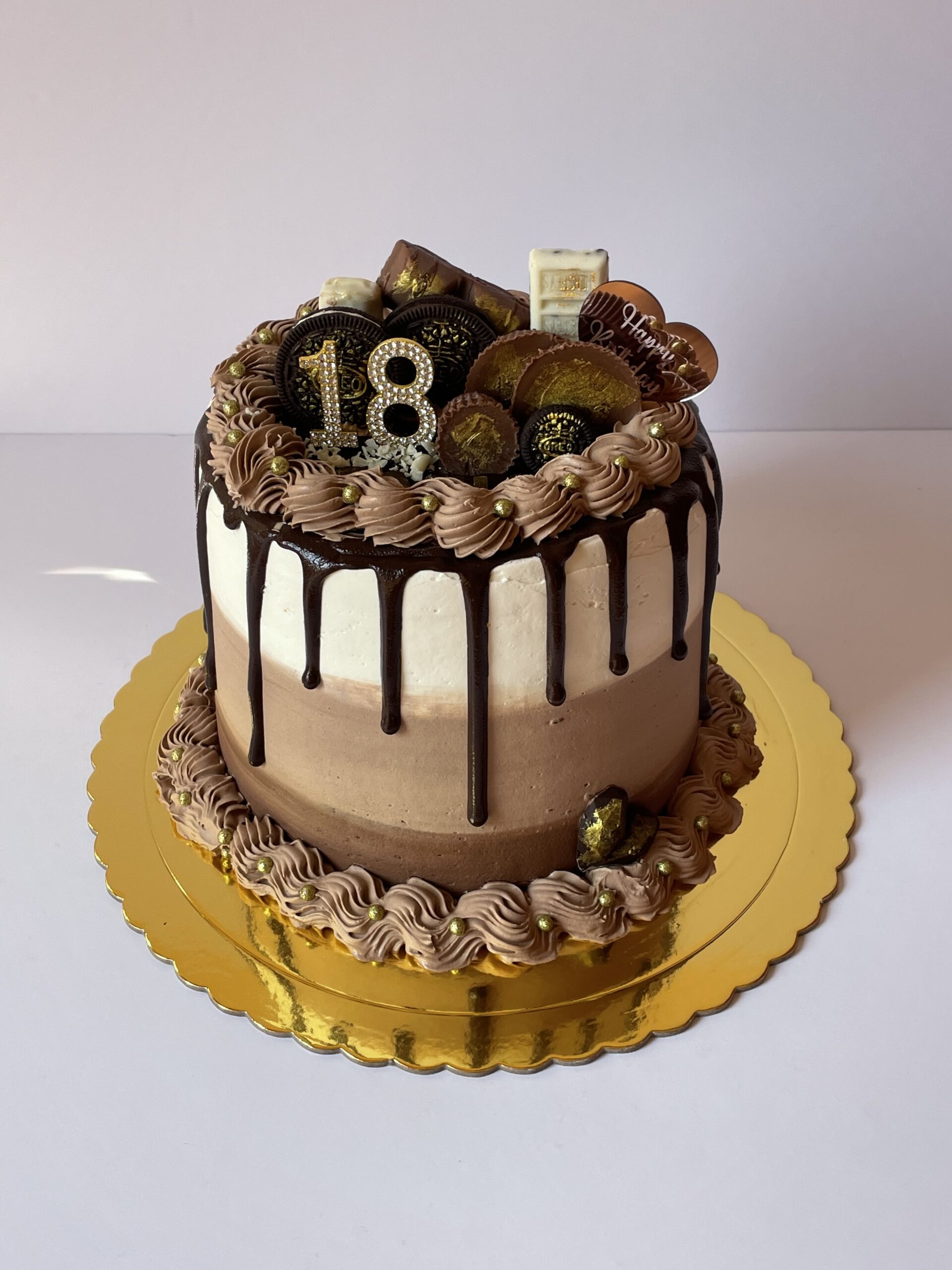 • Decorada con un frosting de queso con drip de chocolate